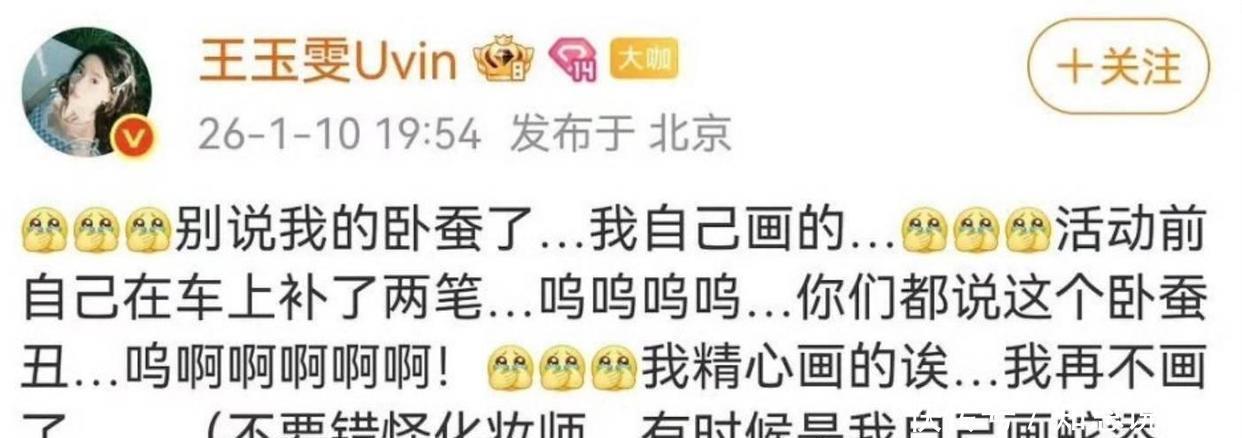 娱乐圈的“甩锅”戏码看多了,突然杀出个王玉雯,直接把“危机公关”玩成了“圈粉现场”。2026年1月,她连续两天主动认领了两桩“审美翻车”事件:先是卧蚕被吐槽像“注水”,她火速发文“是我自己画的,别骂化妆师”。